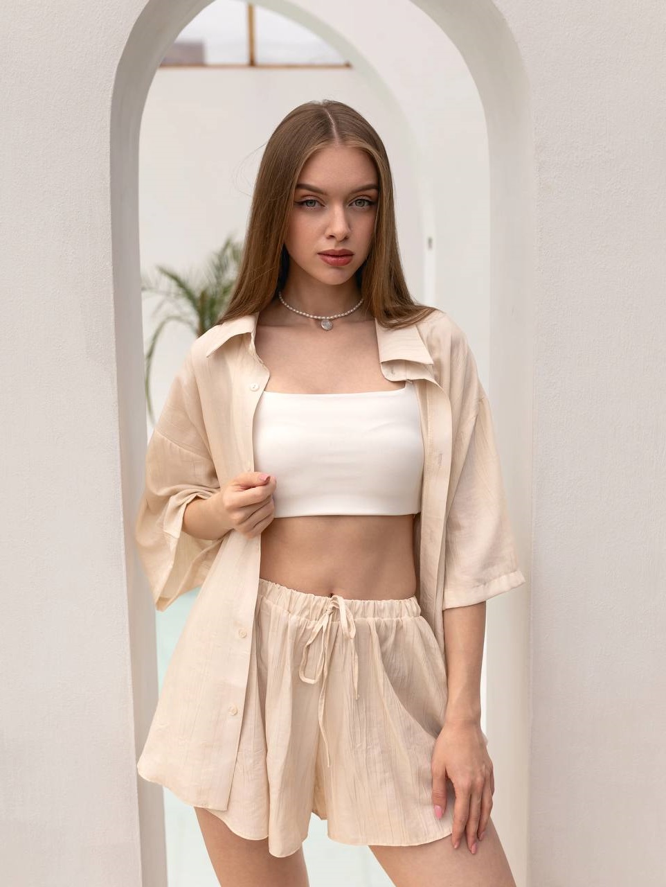 Этот дуэт – шорты и рубашка с укороченным рукавом – создан для лета, благодаря легкой, дышащей ткани с эффектом жатки.