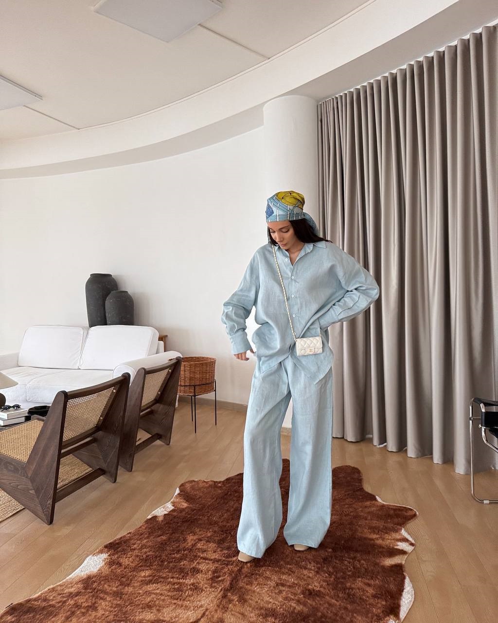 Головна » Магазин » Одяг » Жіночі костюми » Летний льняной костюм свободного кроя (брюки+рубашка) голубой