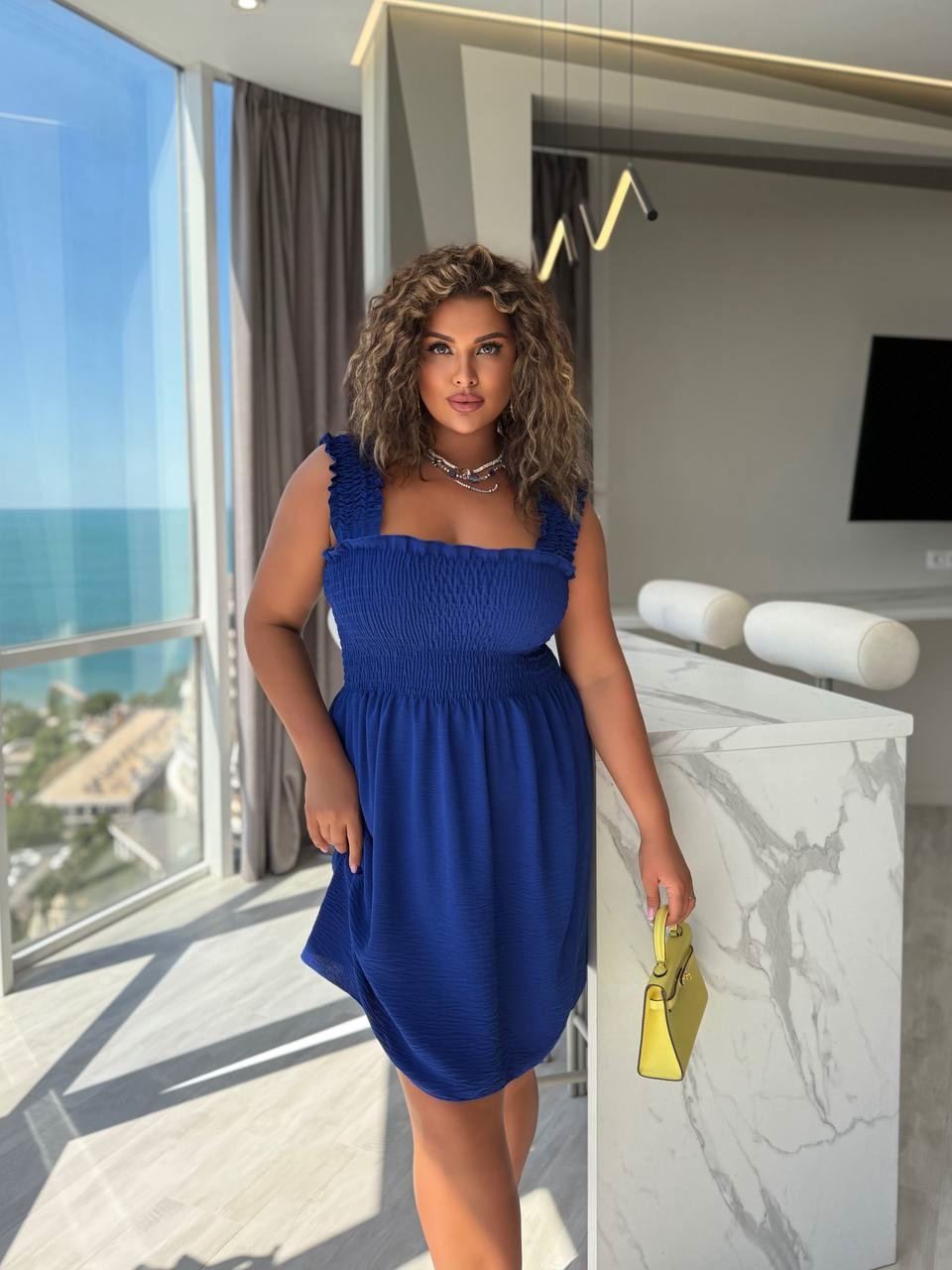 Летний сарафан с широкими бретелями и настроченной резинкой по полочке синий
