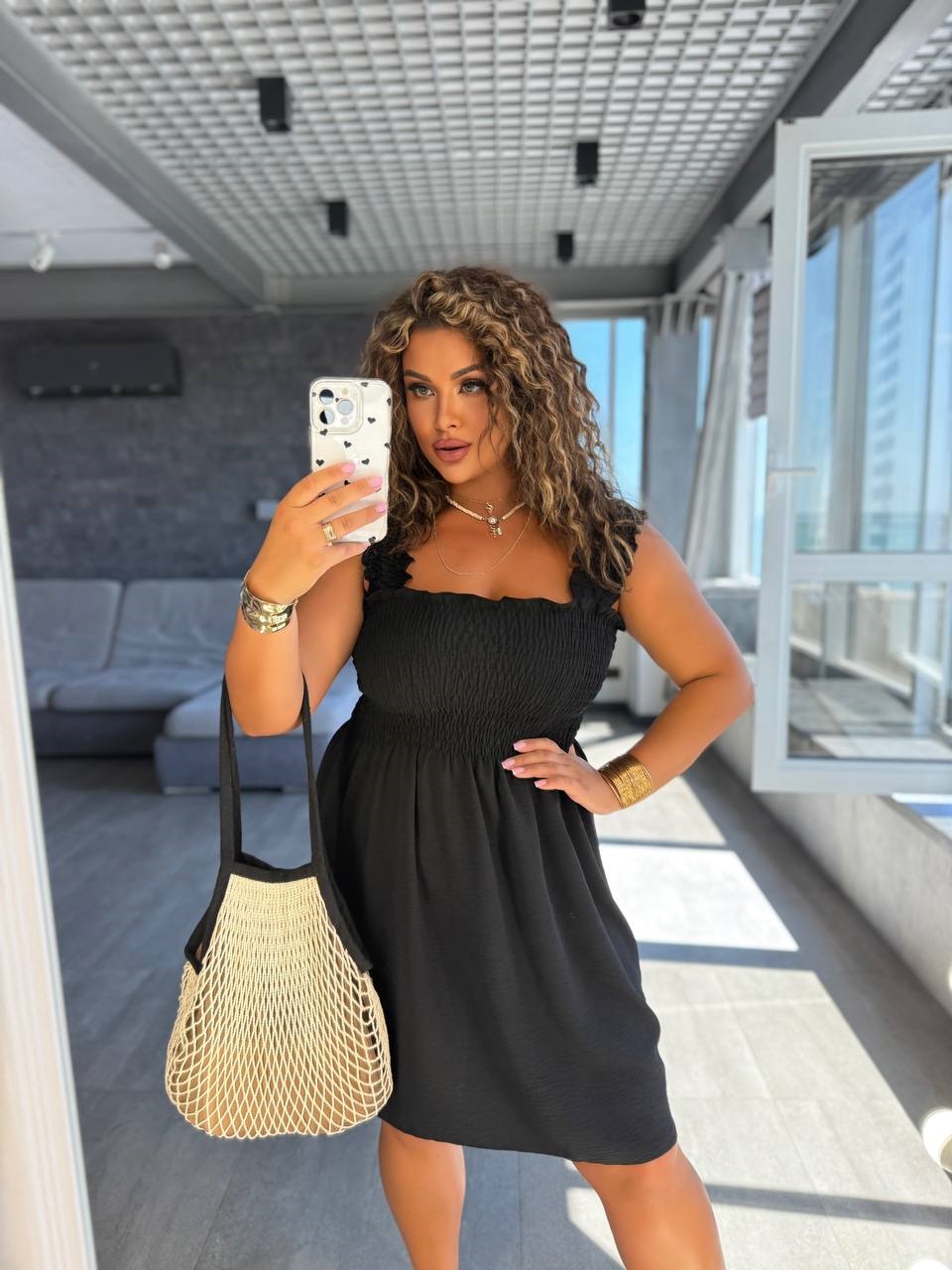 Летний сарафан с широкими бретелями и настроченной резинкой по полочке черный