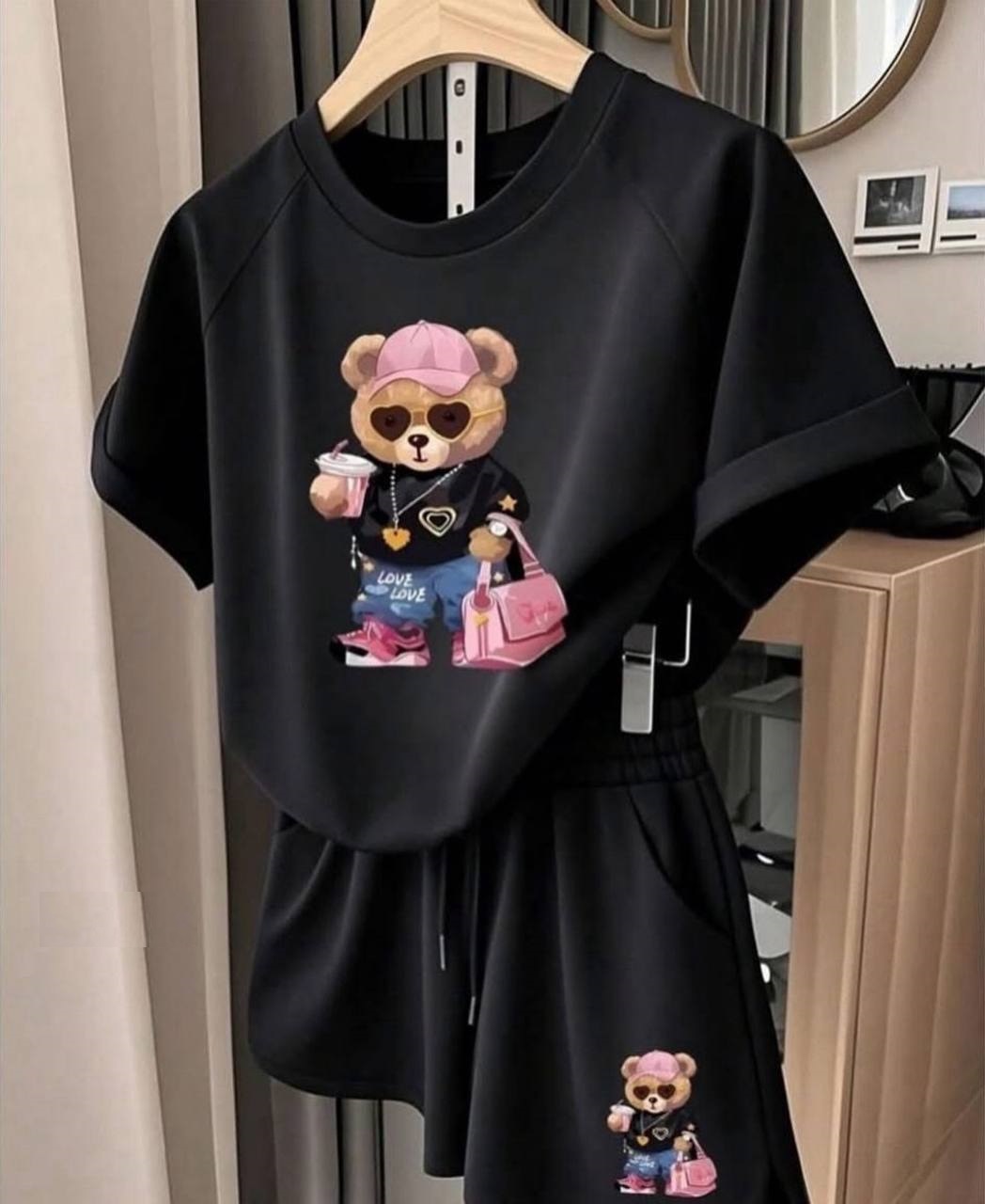 Головна » Магазин » Одяг » Жіночі костюми » Летний Трикотажный костюм с накатом (футболка+шорты) черный