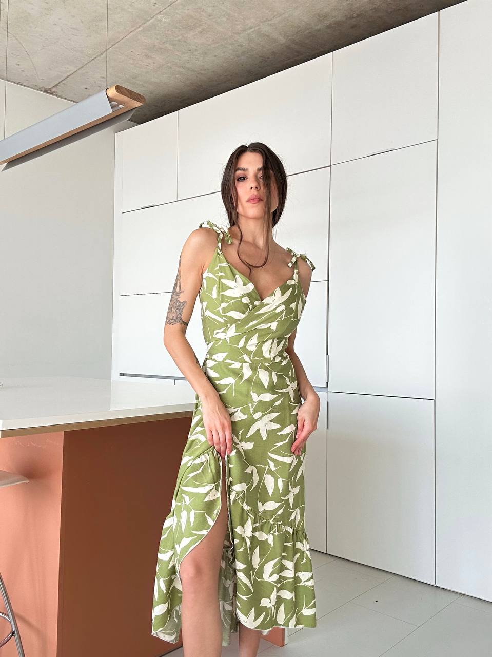 Будьте першим, хто залишив відгук “Льняное платье на бретелях на запах с воланом длиной миди растительный принт оливка”“