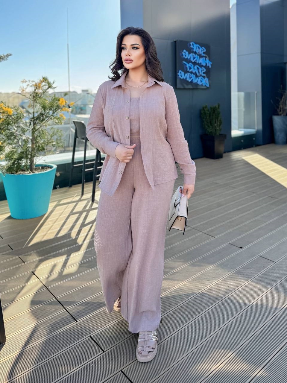 Льняной комфортный костюм (топ+рубашка+брюки) бежевый