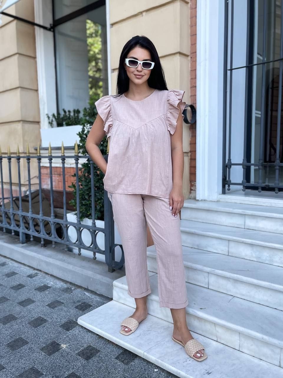 Льняной костюм (блуза с оборочками на рукавах+брюки длиной 7/8) бежевый