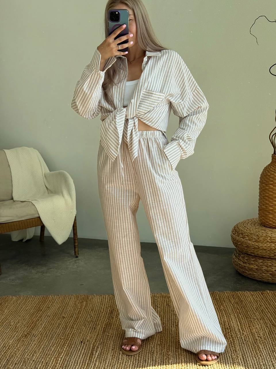 Будьте першим, хто залишив відгук “Льняной костюм на каждый день в пижамном стиле (рубашка+брюки) принт полоска бежевый”“