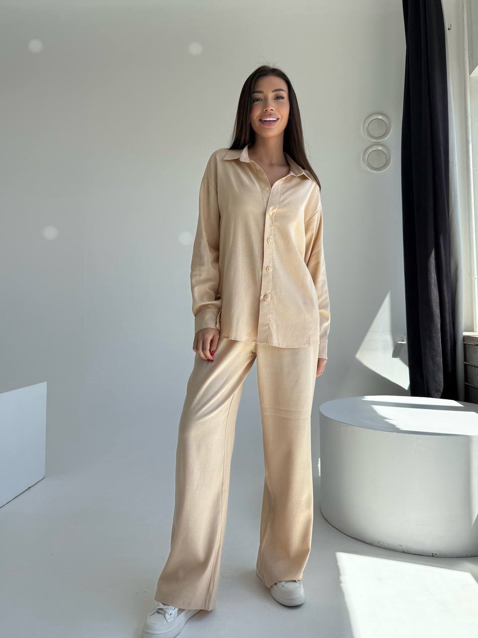 Льняной костюм (рубашка+брюки свободного кроя) светло-бежевый