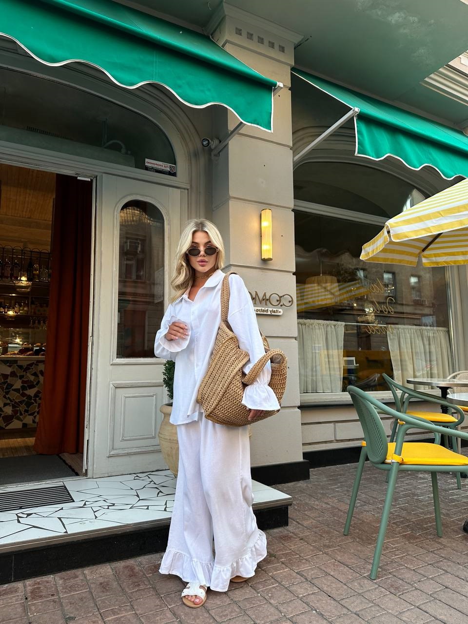 Головна » Магазин » Одяг » Жіночі костюми » Льняной костюм с воланчиками свободного кроя (рубашка+брюки) белый