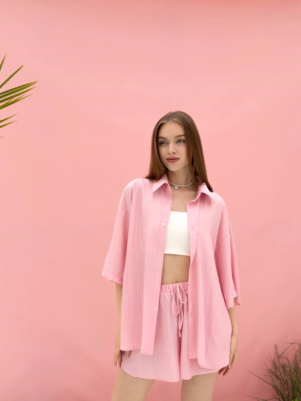Льняной костюм свободного кроя (шорты+рубашка) розовый
