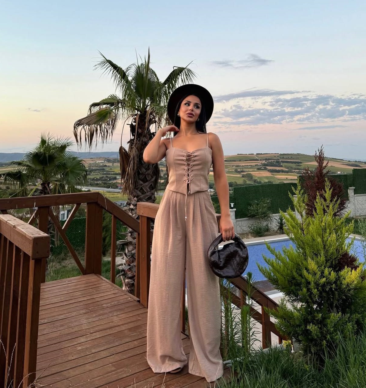 Головна » Магазин » Одяг » Жіночі костюми » Льняной костюм (топ на бретелях со шнуровкой+свободного кроя брюки) бежевый