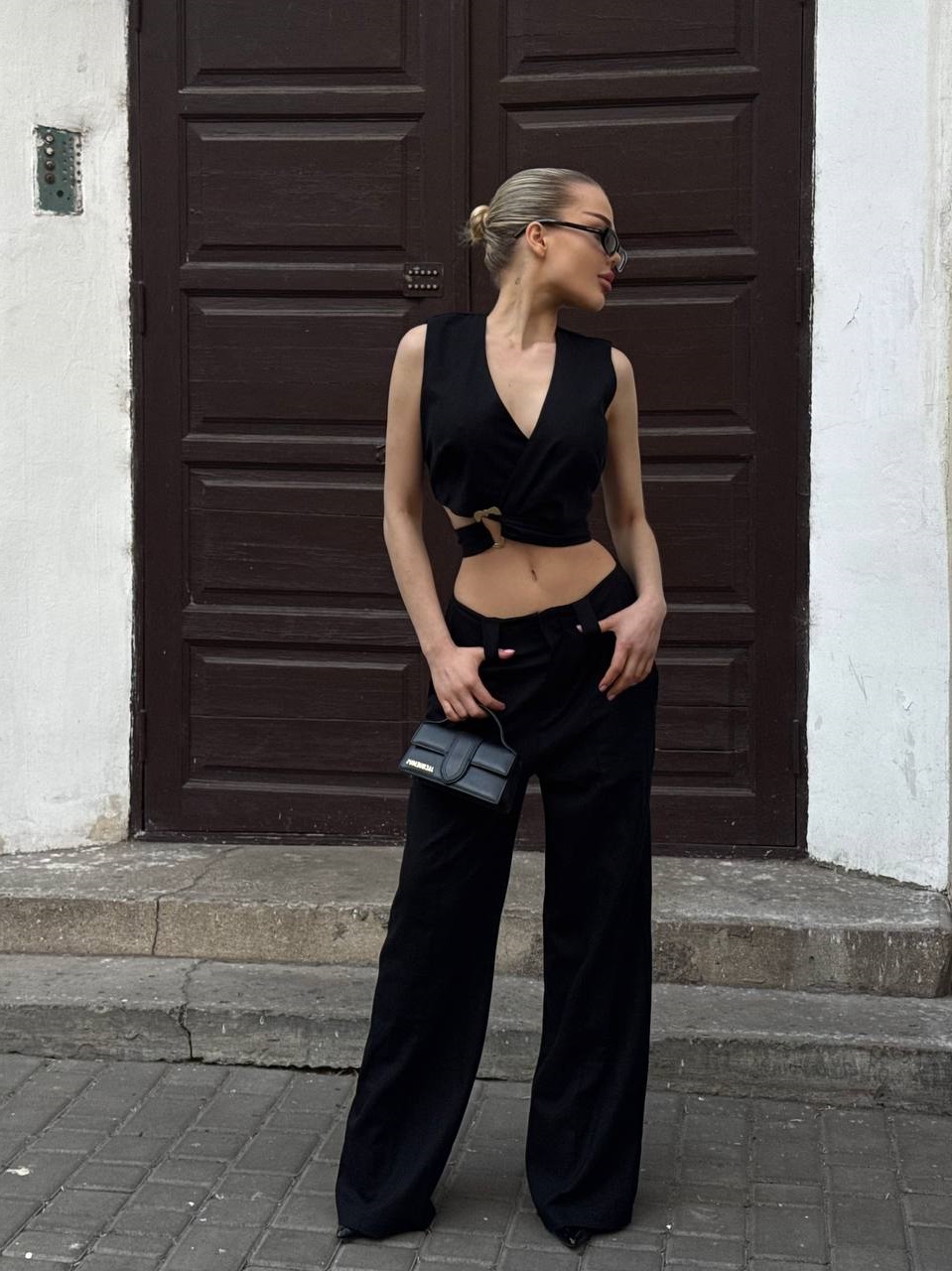 Льняной костюм (укороченный жилет+свободного кроя брюки) черный