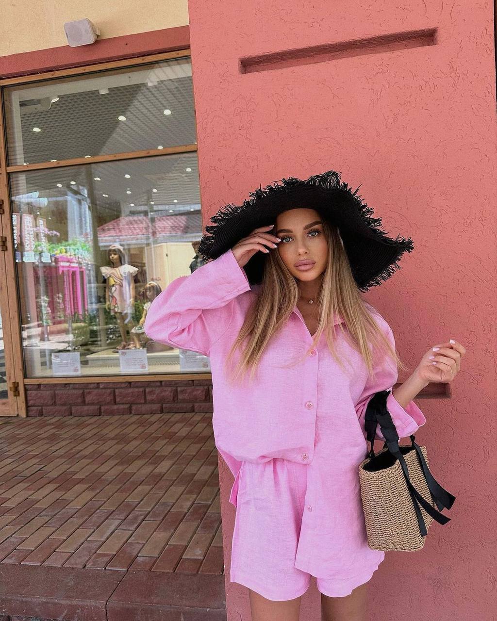 Головна » Магазин » Одяг » Жіночі костюми » Льняной костюмчик двойка рубашка свободная + шорты розовый