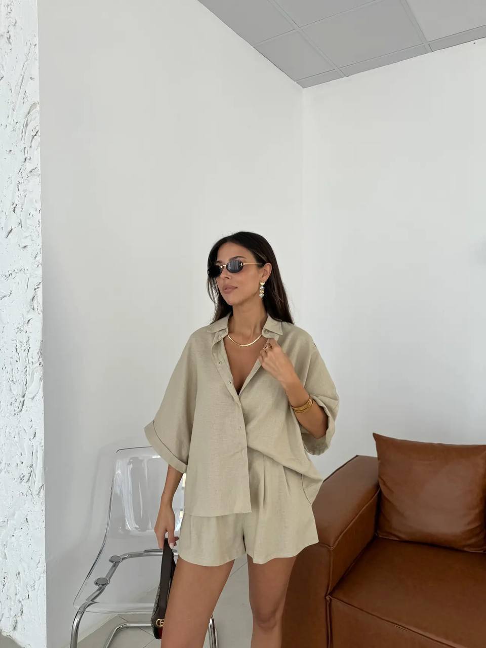 Головна » Магазин » Одяг » Жіночі костюми » Льняной костюмчик рубашка+шорты свободные беж