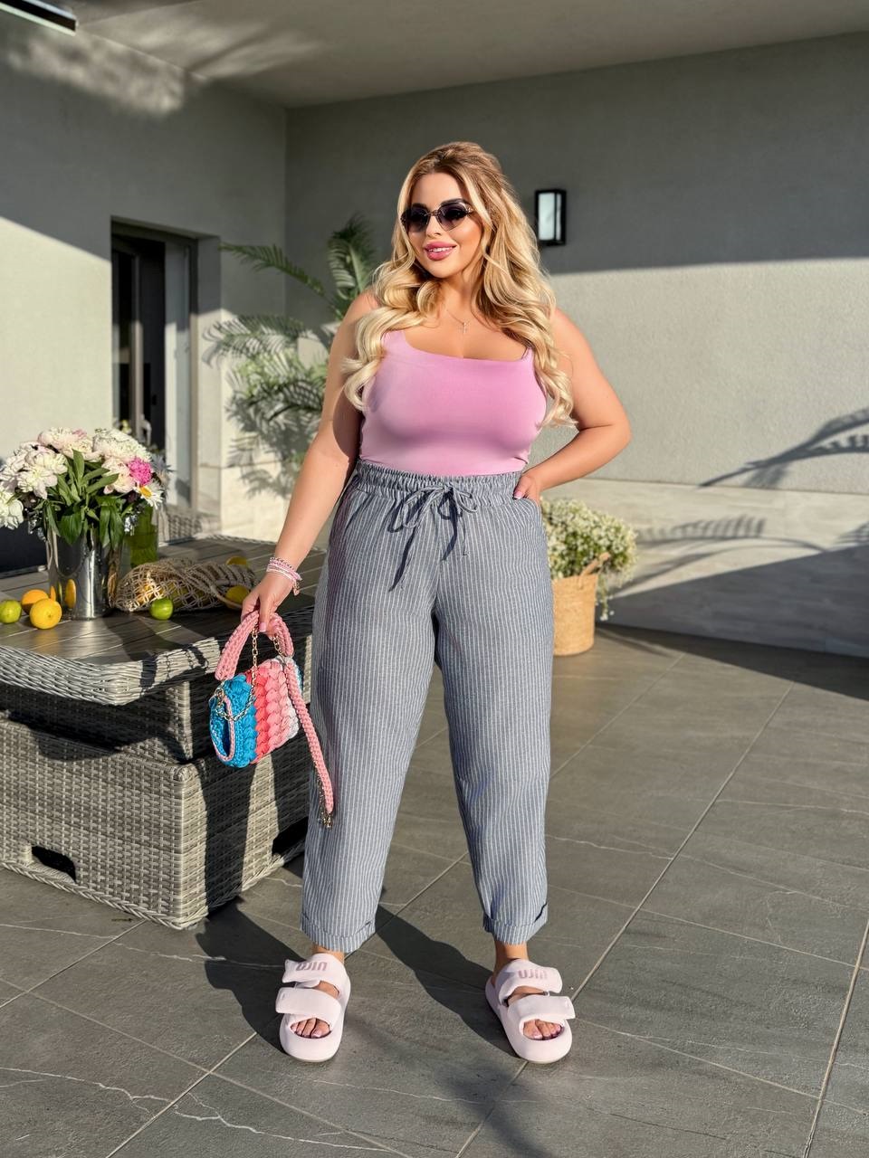 Льняные брюки-бананы с карманами талия на резинке серый в полоску