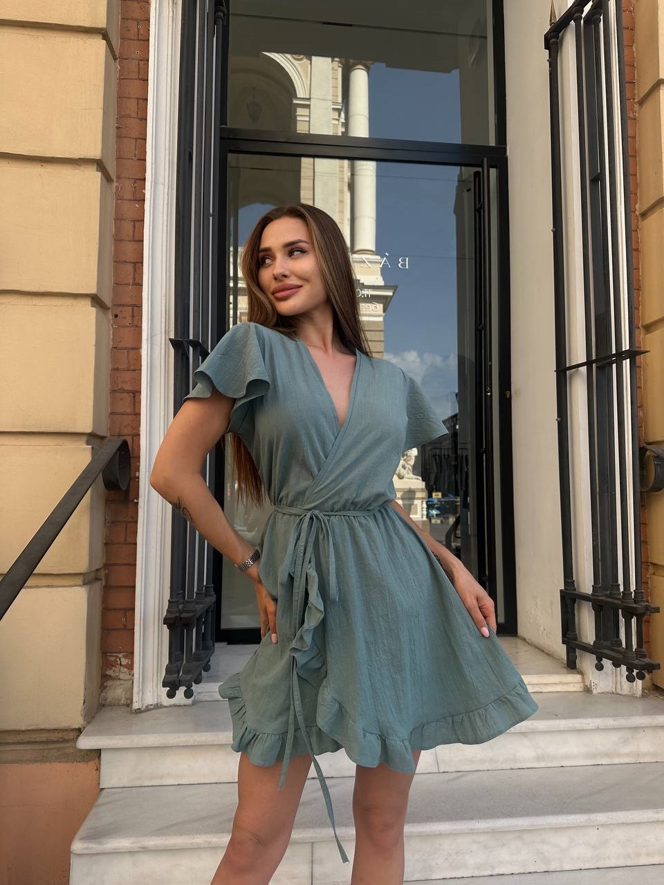 Головна » Магазин » Одяг » Сукня туніка сарафані » Льняный сарафан на запах с воланом по краю сарафана+рукавами-крылышками олива