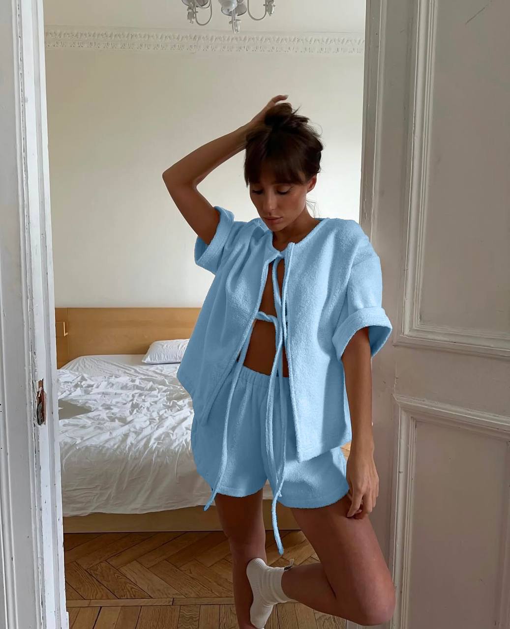 Головна » Магазин » Одяг » Піжама та домашні костюми » Махровая пижамка Рубашка на завязках+шорты голубой