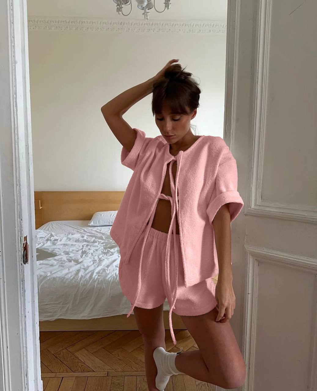 Головна » Магазин » Одяг » Піжама та домашні костюми » Махровая пижамка Рубашка на завязках+шорты персик