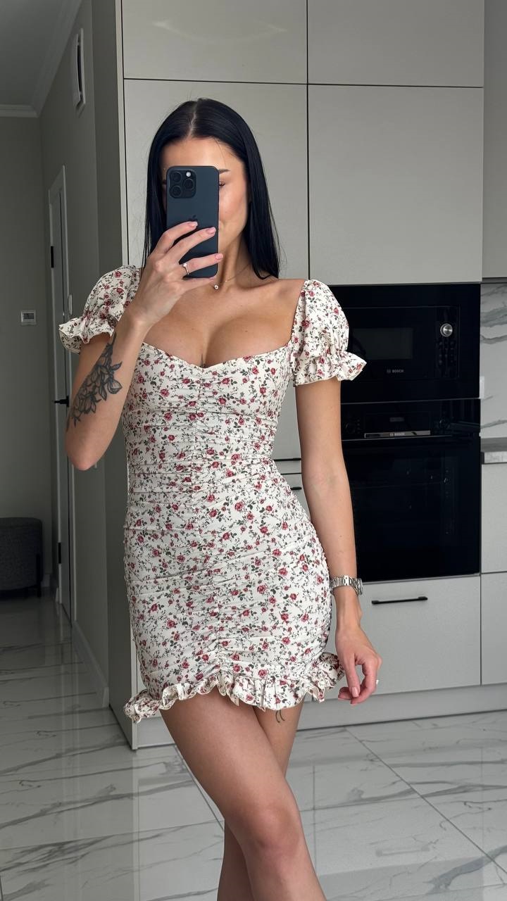 Будьте першим, хто залишив відгук “Мини платье с воланчиком по низу+ рукавчиками, можно носить спущенными бежевый в цветочки”“