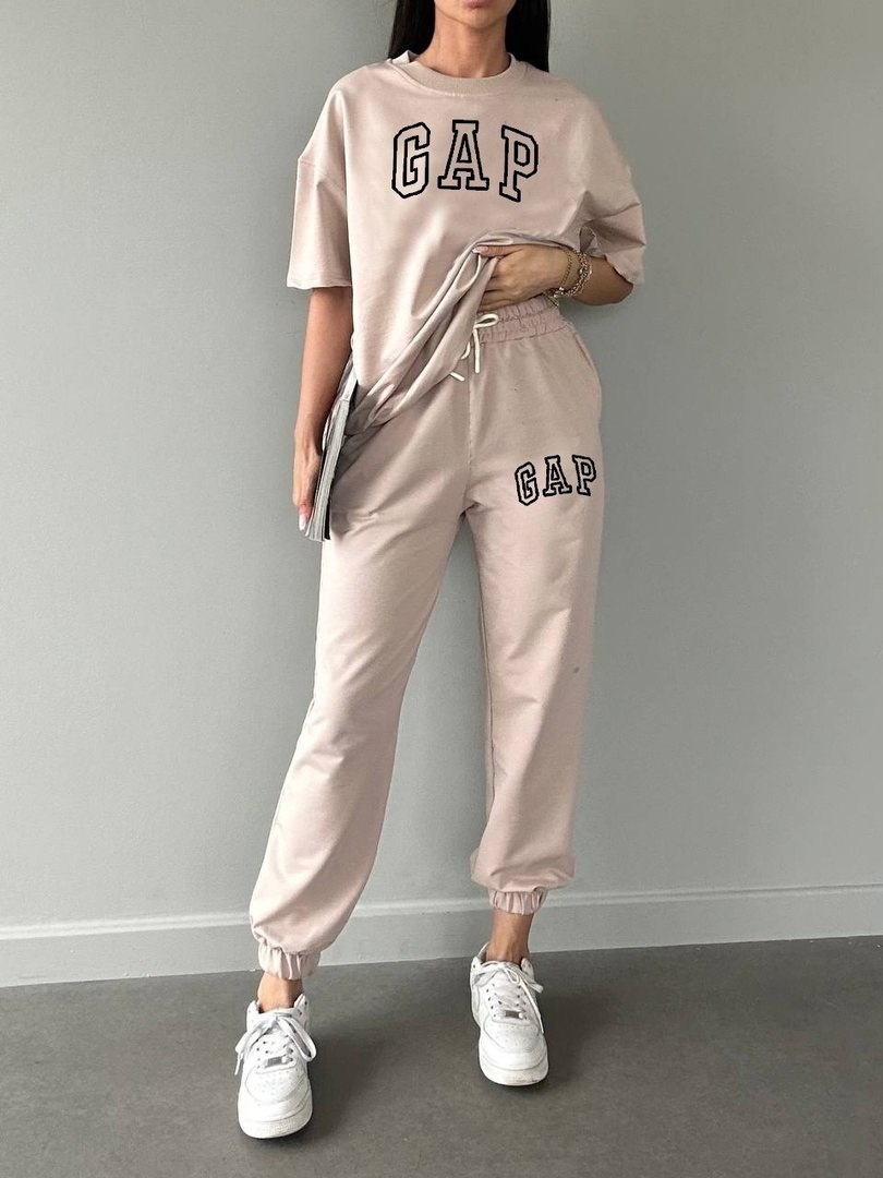 Молодежный спортивный костюм с качественным накатом двухнить футболка+штаны беж