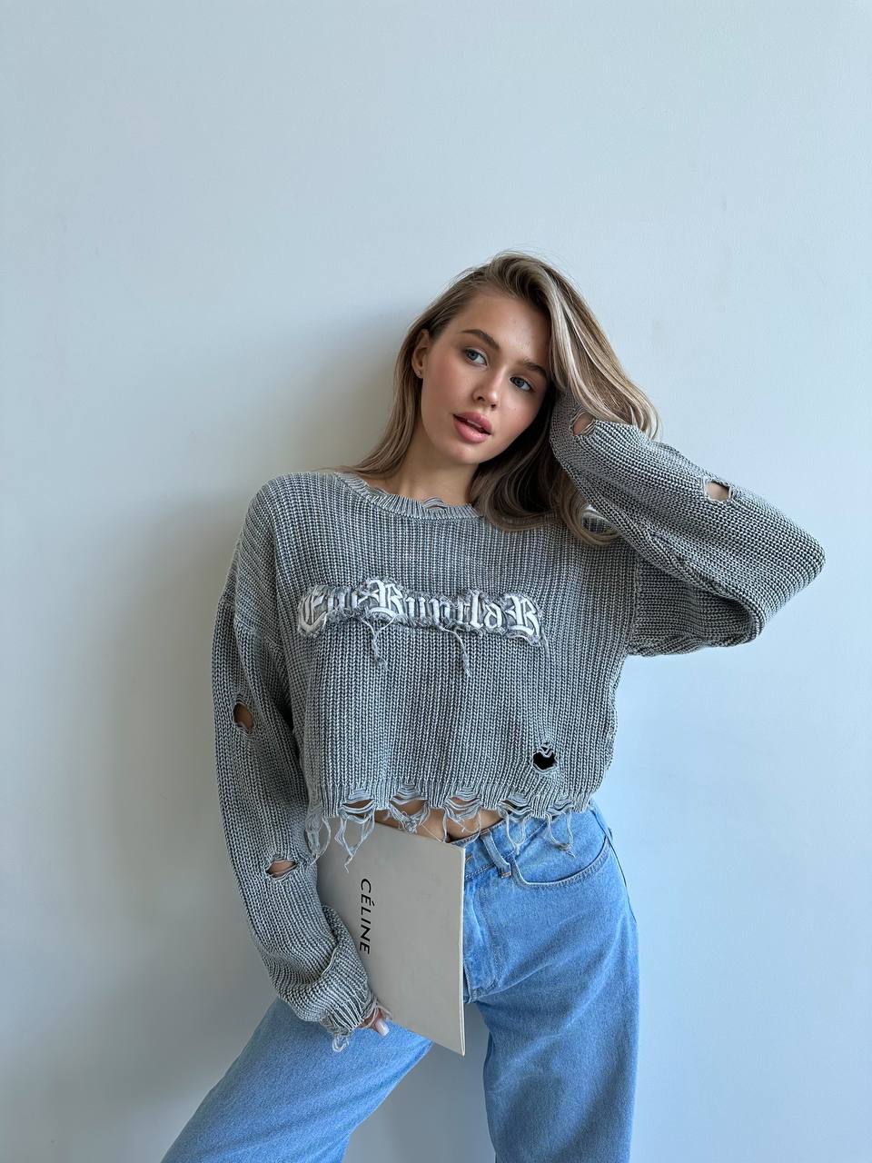 Головна » Магазин » Одяг » Кофти, толстовки, худі, светри » Молодежный укороченный свитер варенка с дорожками из распущенных петель+надписью серый