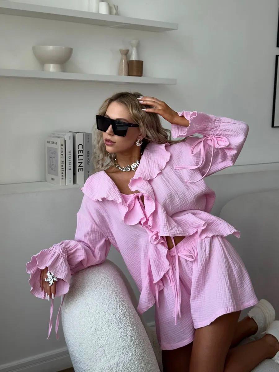 Муслиновый костюм: рубашка с воланами и длинным рукавом+шорты барби
