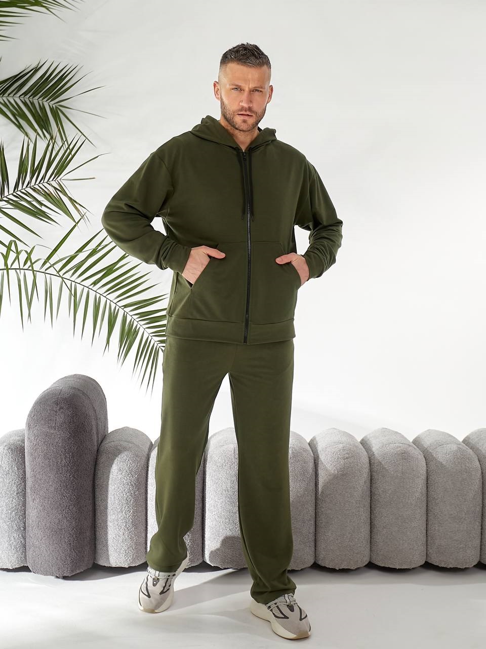Мужской костюм из двухнитки (кофта на молнии с капюшоном+брюки с карманами) хаки