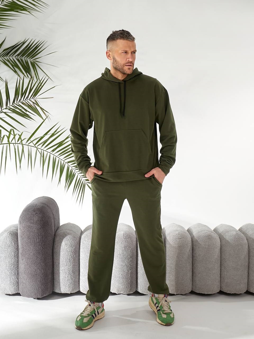 Мужской костюм из двухнитки (кофта с капюшоном+карманом+брюки низ на резинке) хаки