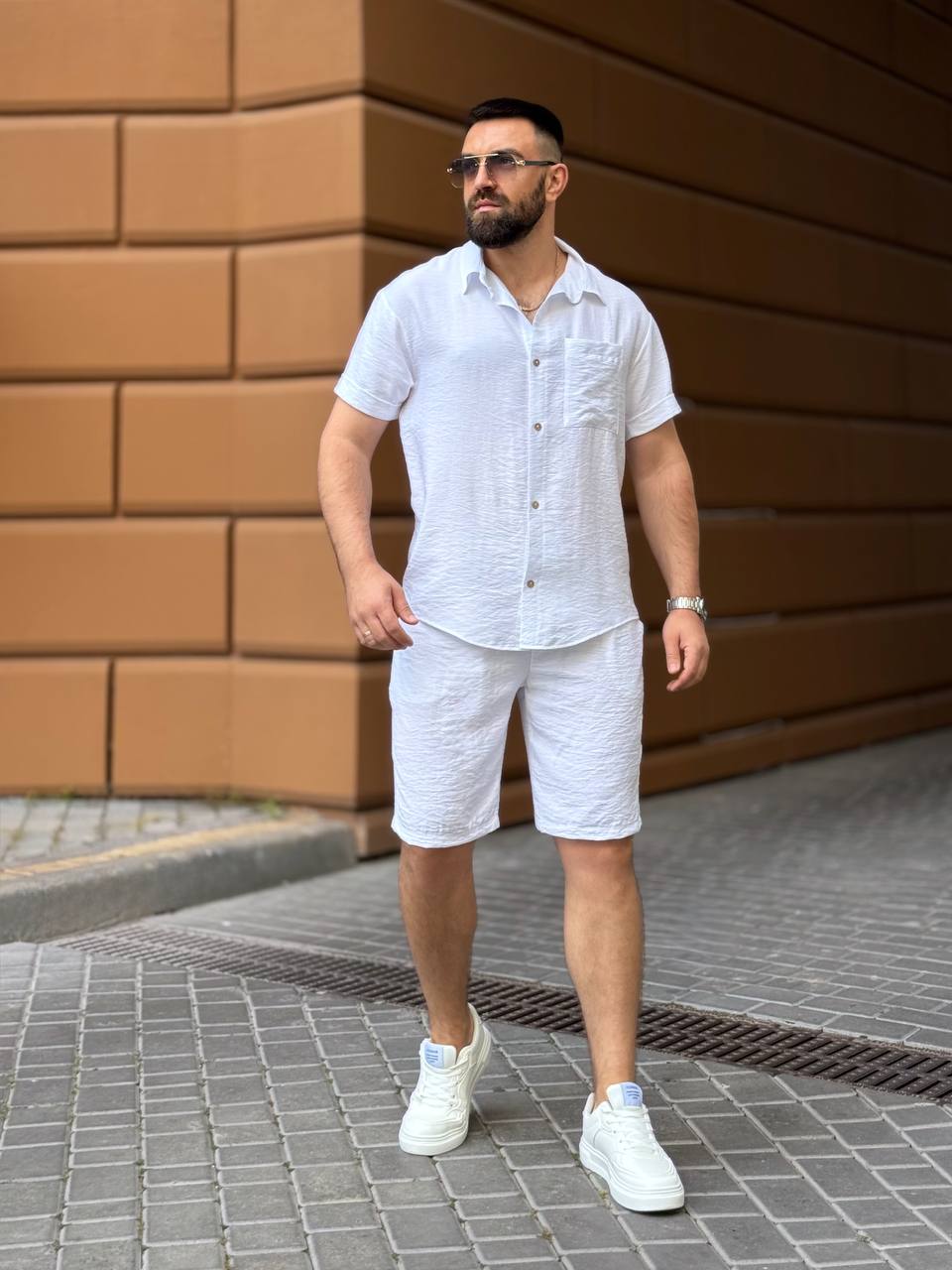 Мужской костюм из льна: рубашка свободная с коротким рукавом+шорты с карманами белый