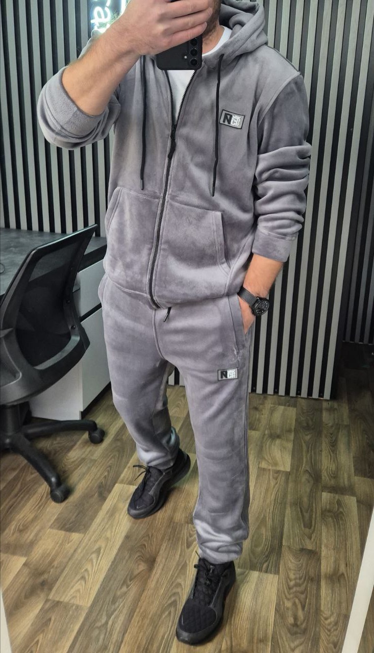 Мужской костюм из велюра (кофта на молнии с капюшоном+брюки с карманами) серый