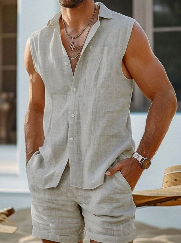Головна » Магазин » Одяг » Чоловічі костюми » Мужской костюм лен-жатка: рубашка без рукавов+шорты серый