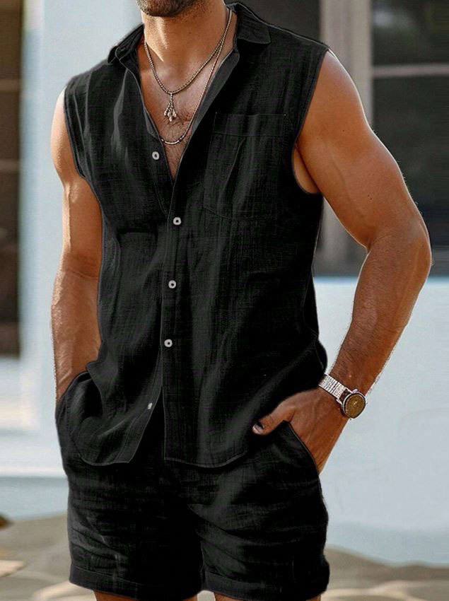 Головна » Магазин » Одяг » Чоловічі костюми » Мужской костюм лен-жатка: рубашка без рукавов+шорты черный