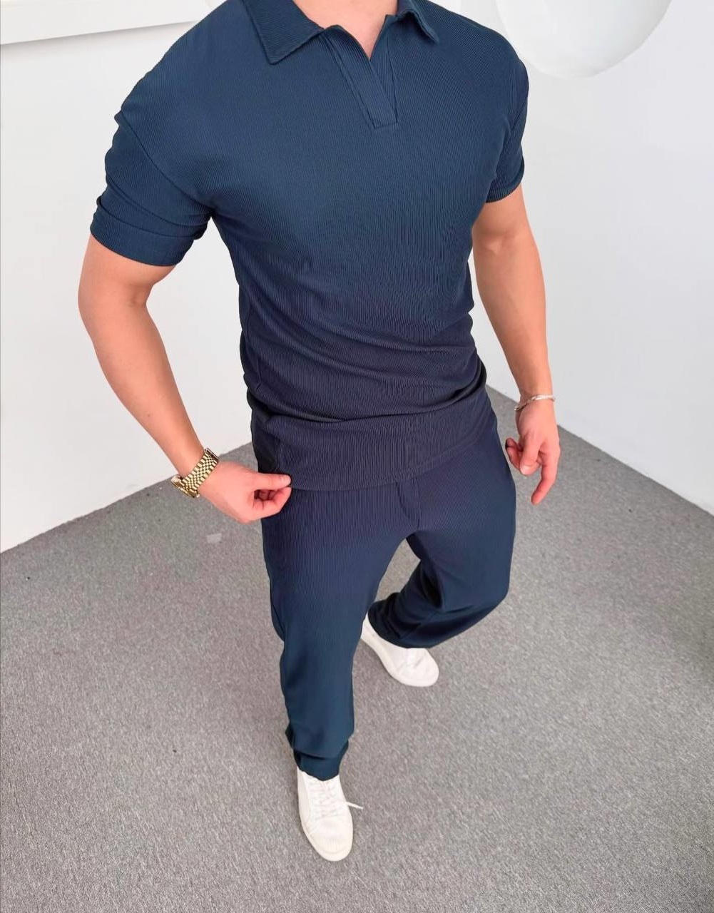 Будьте першим, хто залишив відгук “Мужской трикотажный костюм в рубчик(брюки+кофта с отложным воротником) синий”“