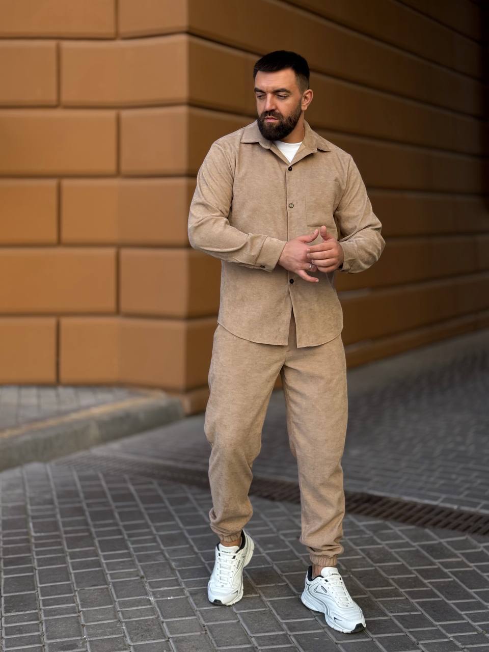 Мужской вельветовый костюм: рубашка на пуговицах и удобные джоггеры с карманами, стильное и комфортное сочетание для современного образа.