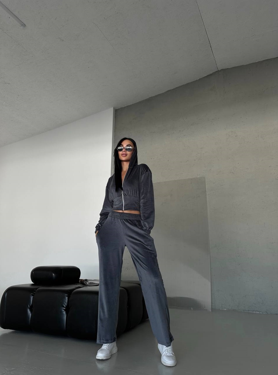 Мягкий велюровый костюм (укороченная кофта на молнии с капюшоном+брюки прямого кроя) графит
