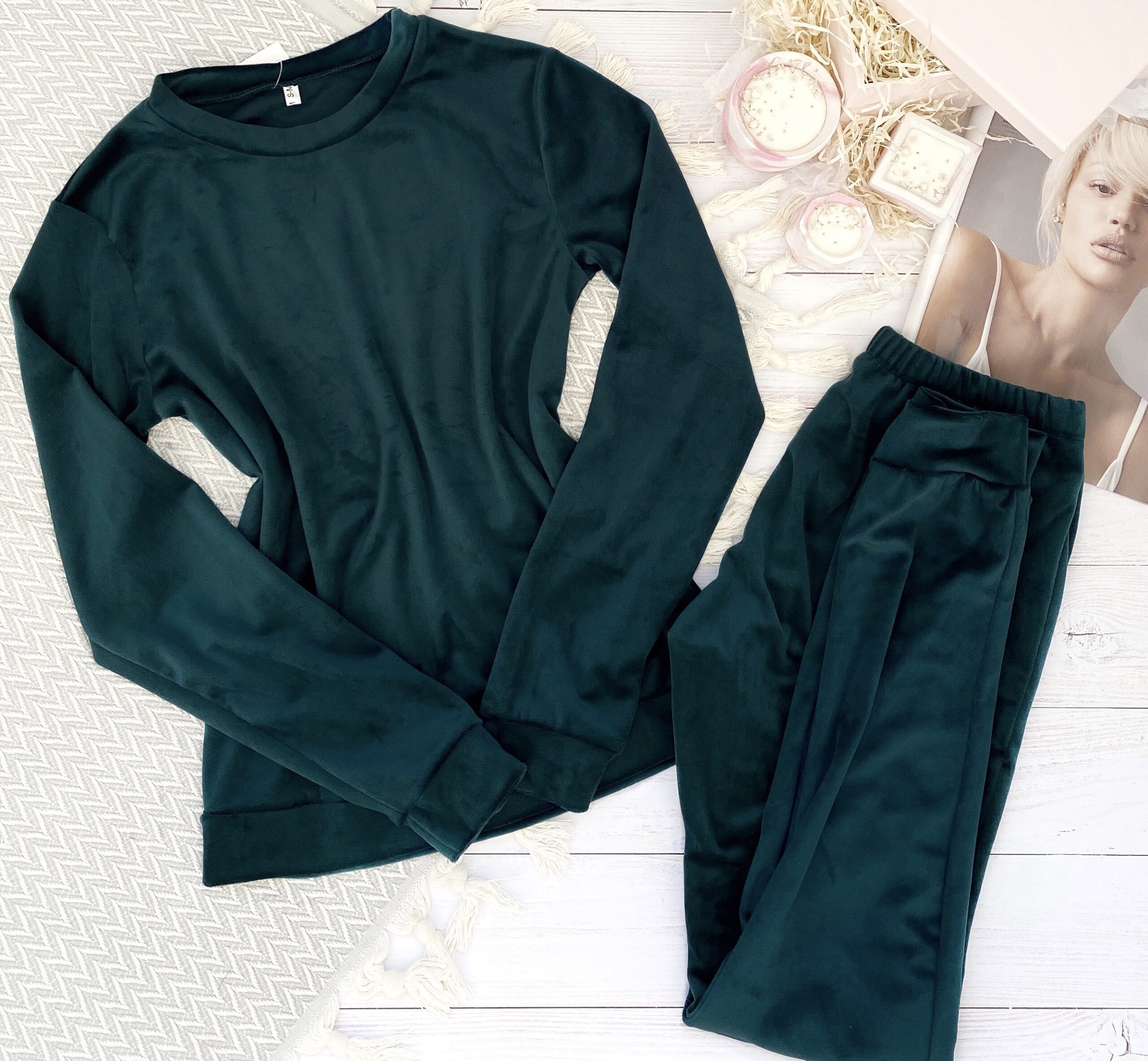Комплект кофты и брюки. Выполнен из мягкой плюшевой ткани, приятен к телу. На манжетах.