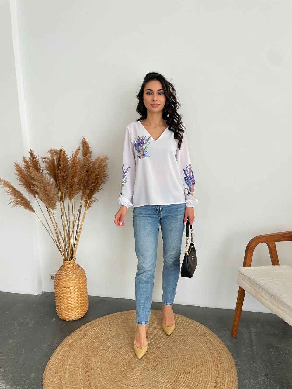 Невероятная блузка с V-образным вырезом принт ФИОЛЕТОВЫЙ БУКЕТ