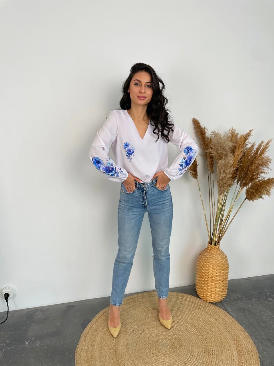 Невероятная блузка с V-образным вырезом принт ГОЛУБЫЕ ЦВЕТЫ белый