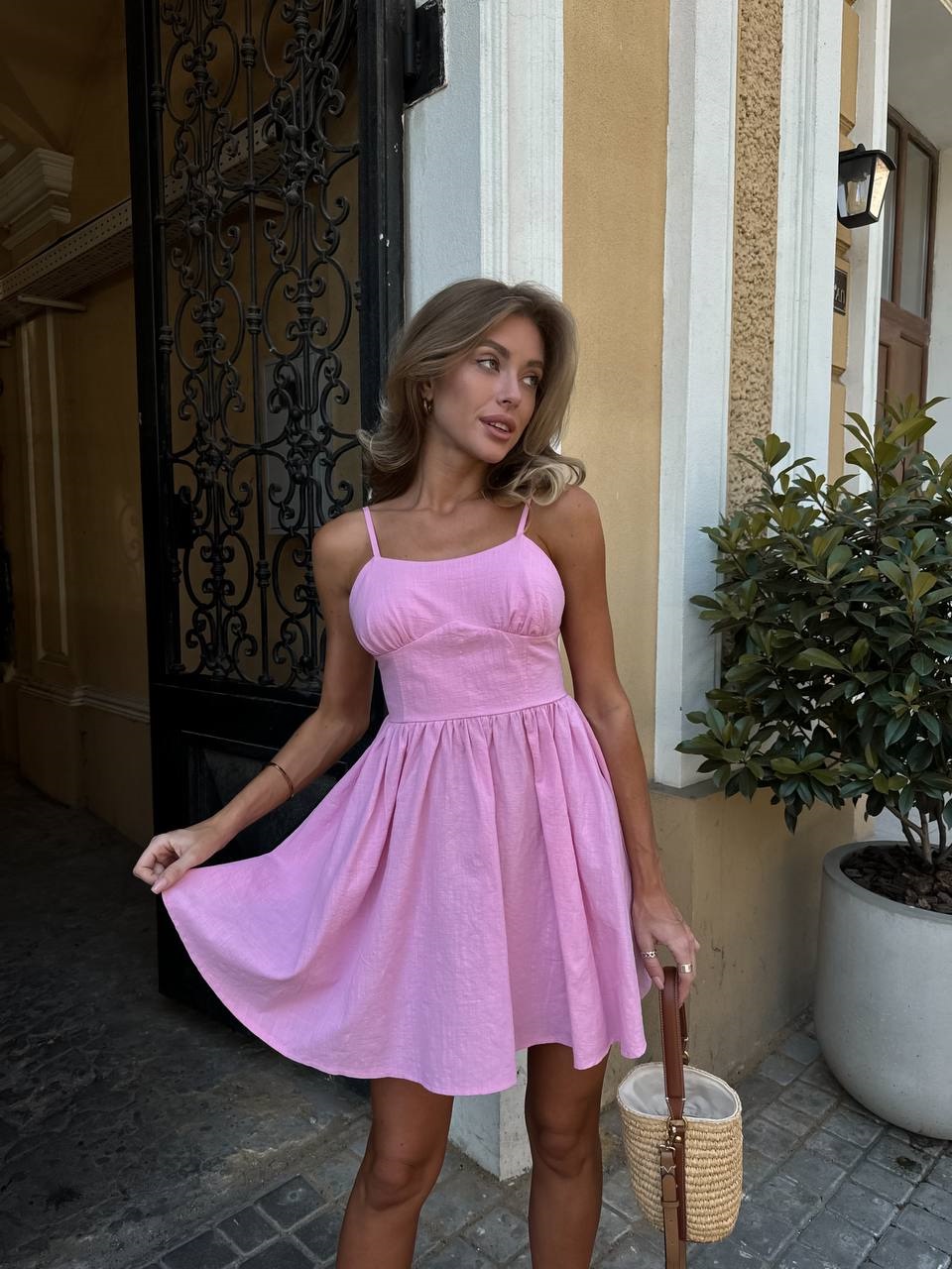 Невесомое воздушное платье из льна на тонких бретельках с красивой линией талии барби