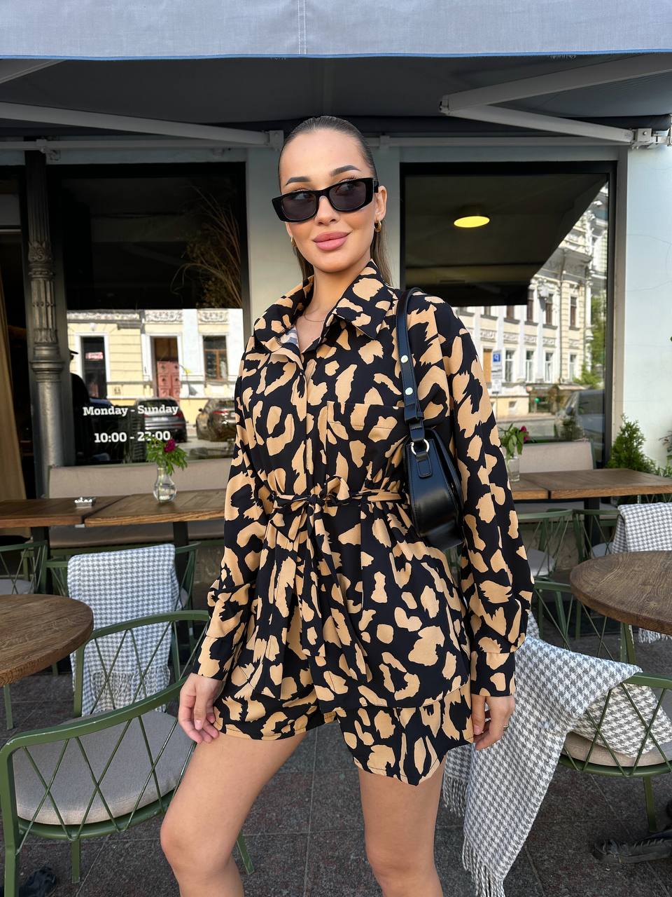 Невесомый, воздушный и универсальный костюм, рубашка с объемными рукавами и шорты свободного кроя. Пояс уходит в комплект.