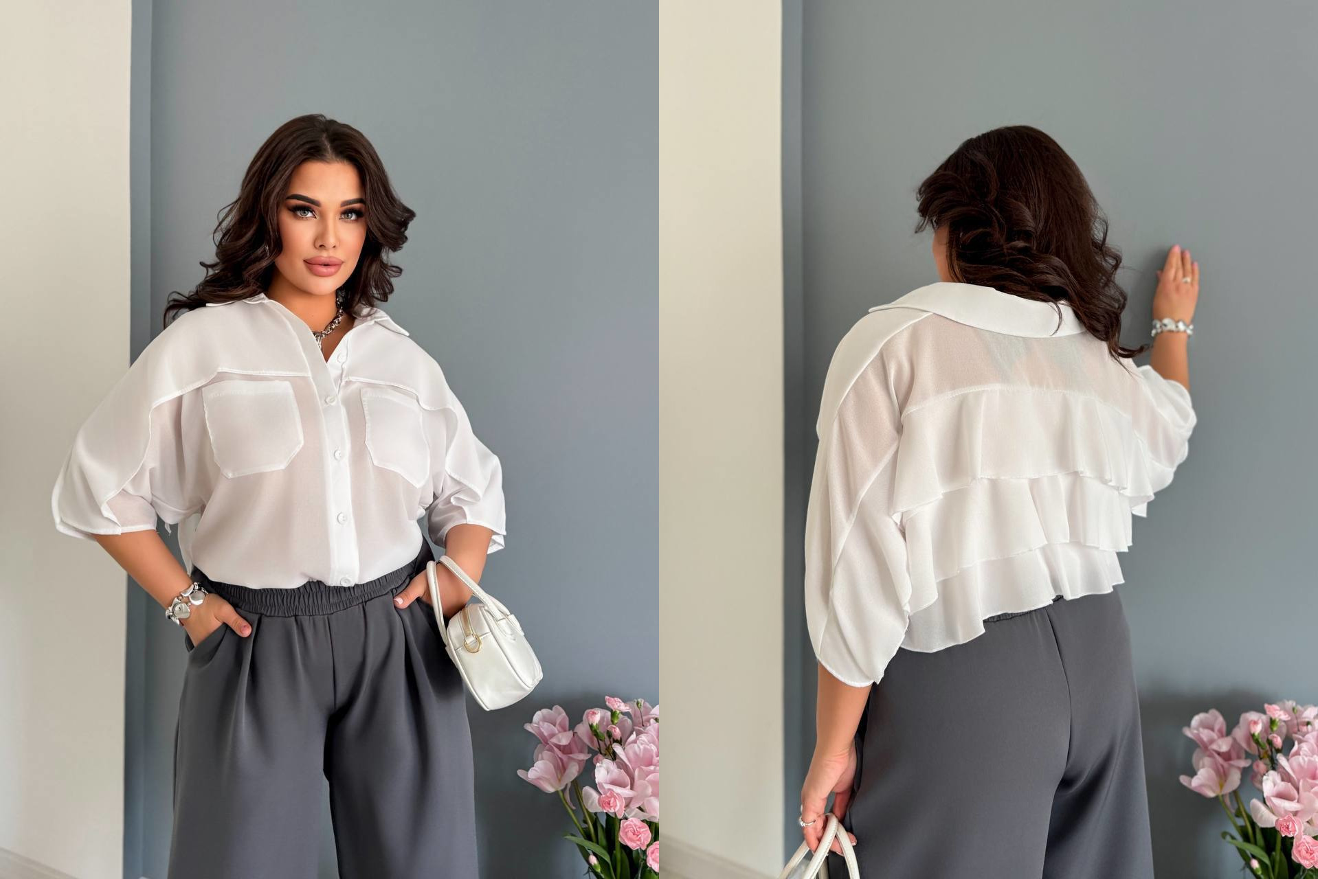 Головна » Магазин » Одяг » Куртки сорочки » Нежная рубашка с карманами на рруди+воланами на спинке белый