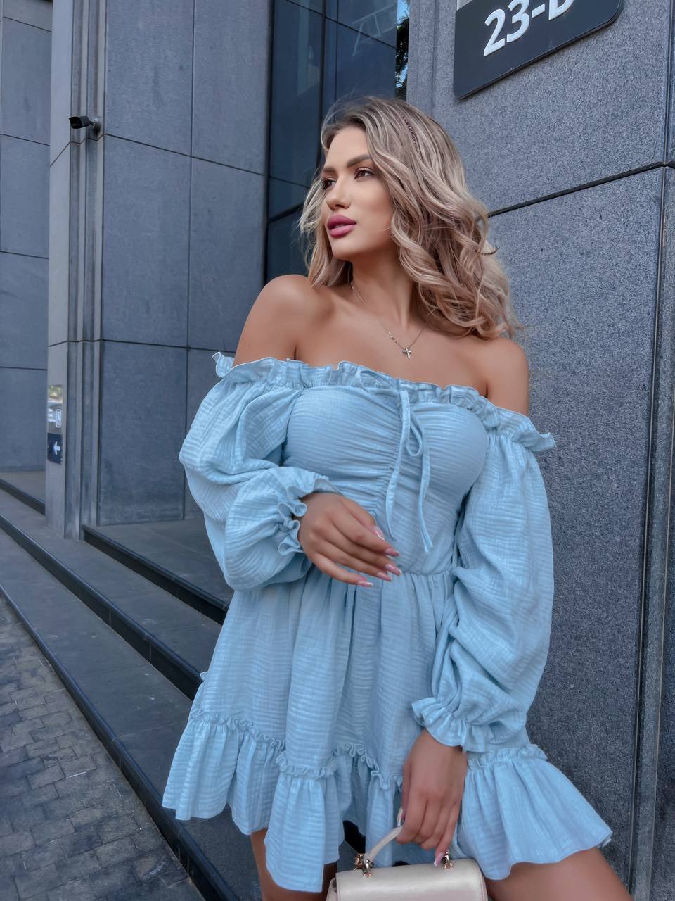 Нежное и романтичное платье с длинным рукавом фонарик на резинке голубой