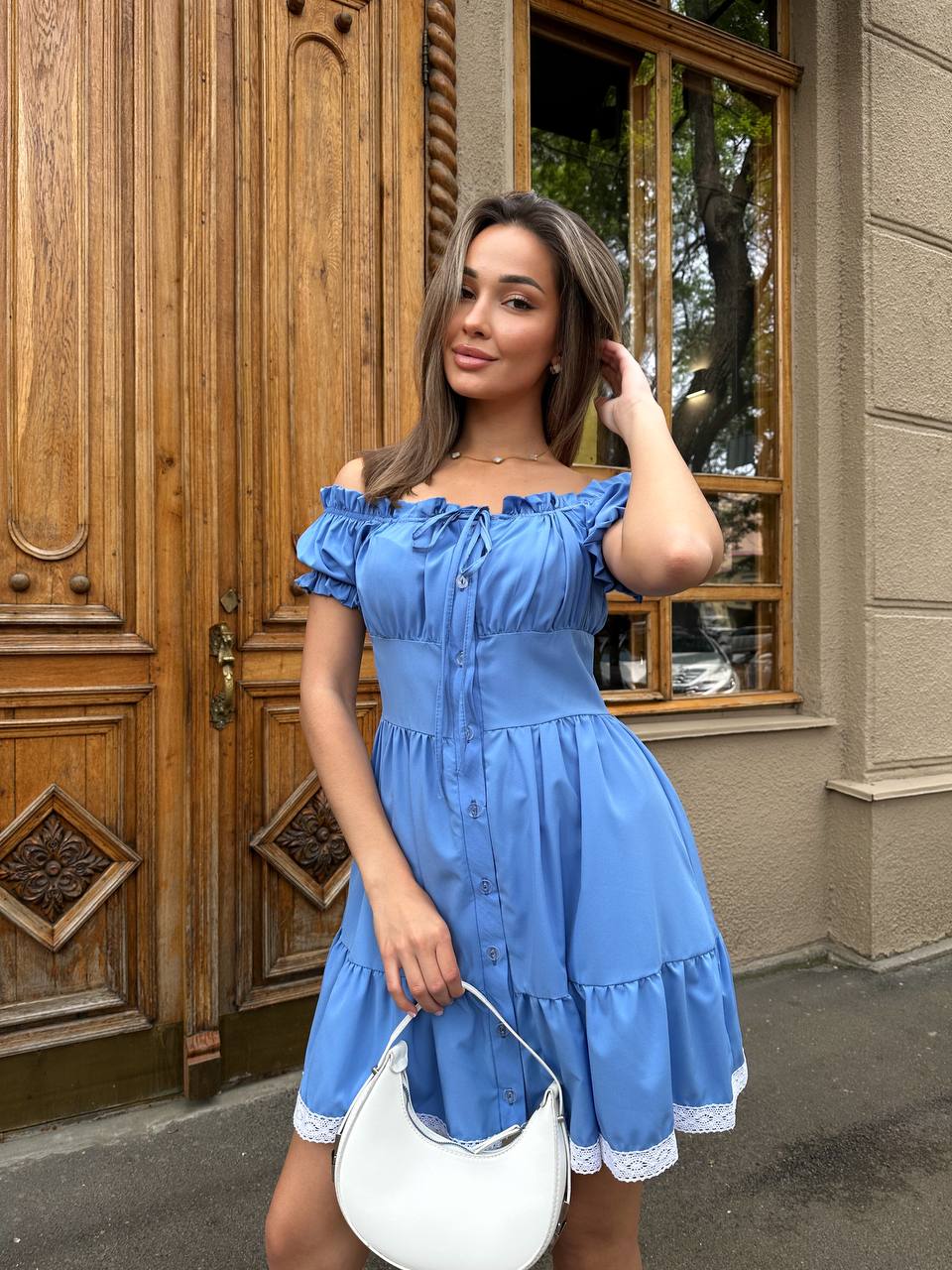 Нежное платье на пуговицах и с кружевом голубой