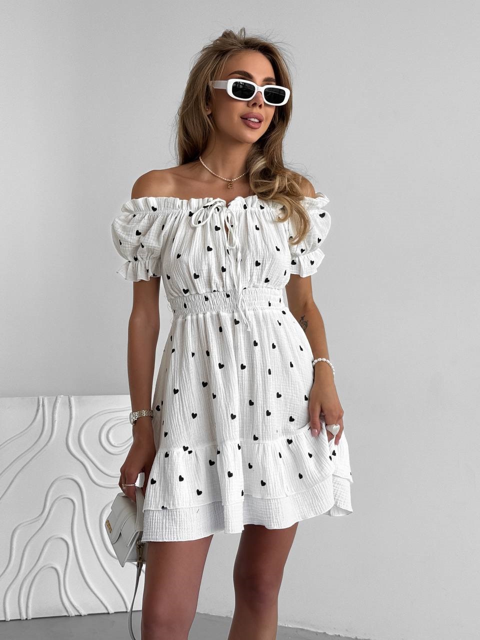 Нежное платье талия на резинке+юбка с воланом белый принт черные сердечки