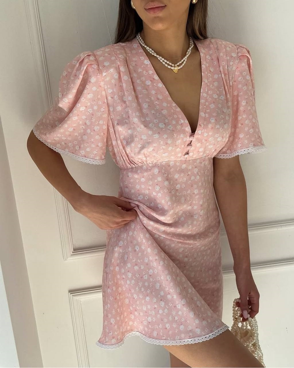 Головна » Магазин » Одяг » Сукня туніка сарафані » Нежное шелковистое платье в цветочный принт с завышенной линией талии персик