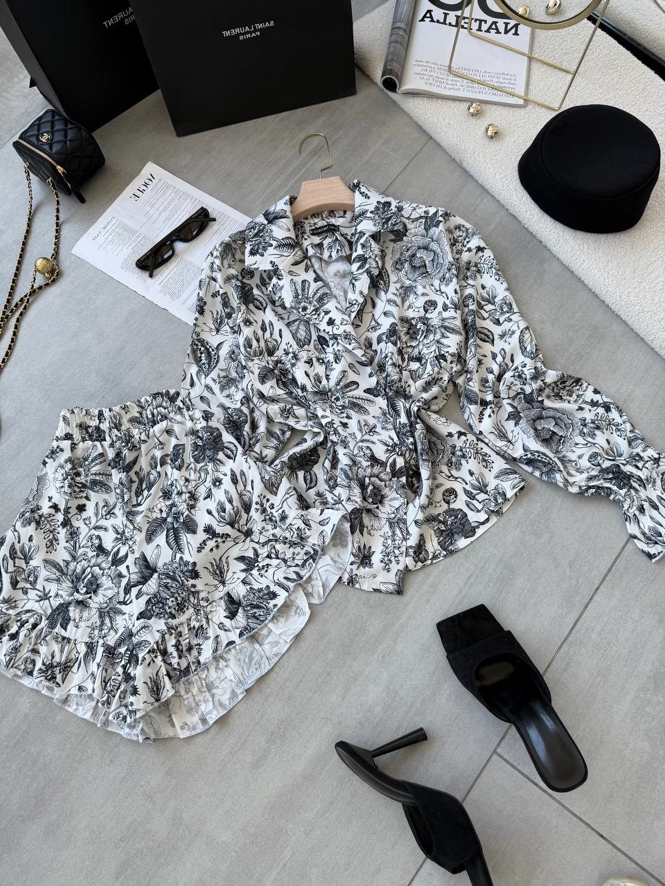 Головна » Магазин » Одяг » Жіночі костюми » Нежный костюм на лето (шортики с оборочкой+рубашка с длинным рукавом) черный