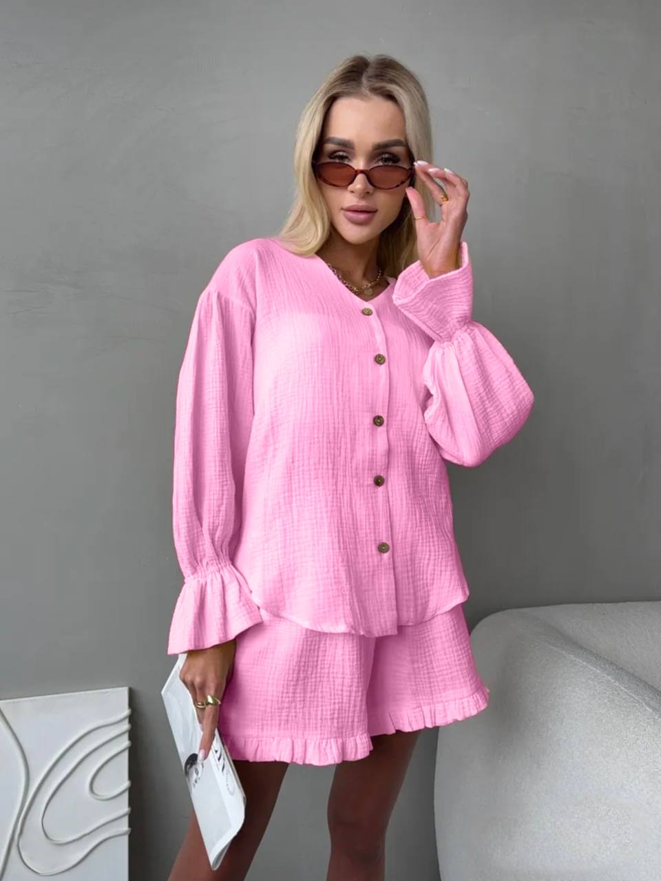 Нежный на ощупь, легкий на теле – костюм из натурального муслина, в котором хочется жить все лето. Свободная рубашка на пуговицах, шорты с рюшей – все, что нужно для комфорта