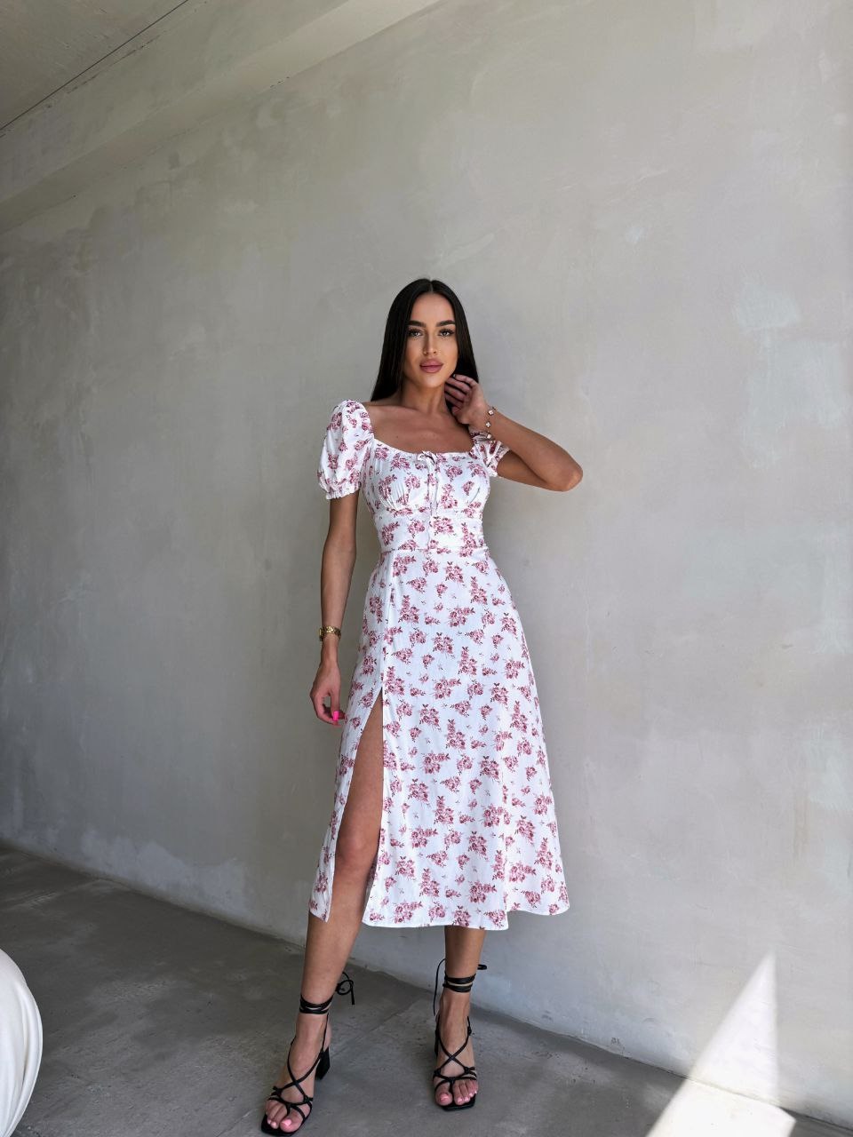 Нежный цветочный сарафан, длина миди, разрез по ножке, открытая спинка, на талии завязки, что позволит приталить силуэт под себя.