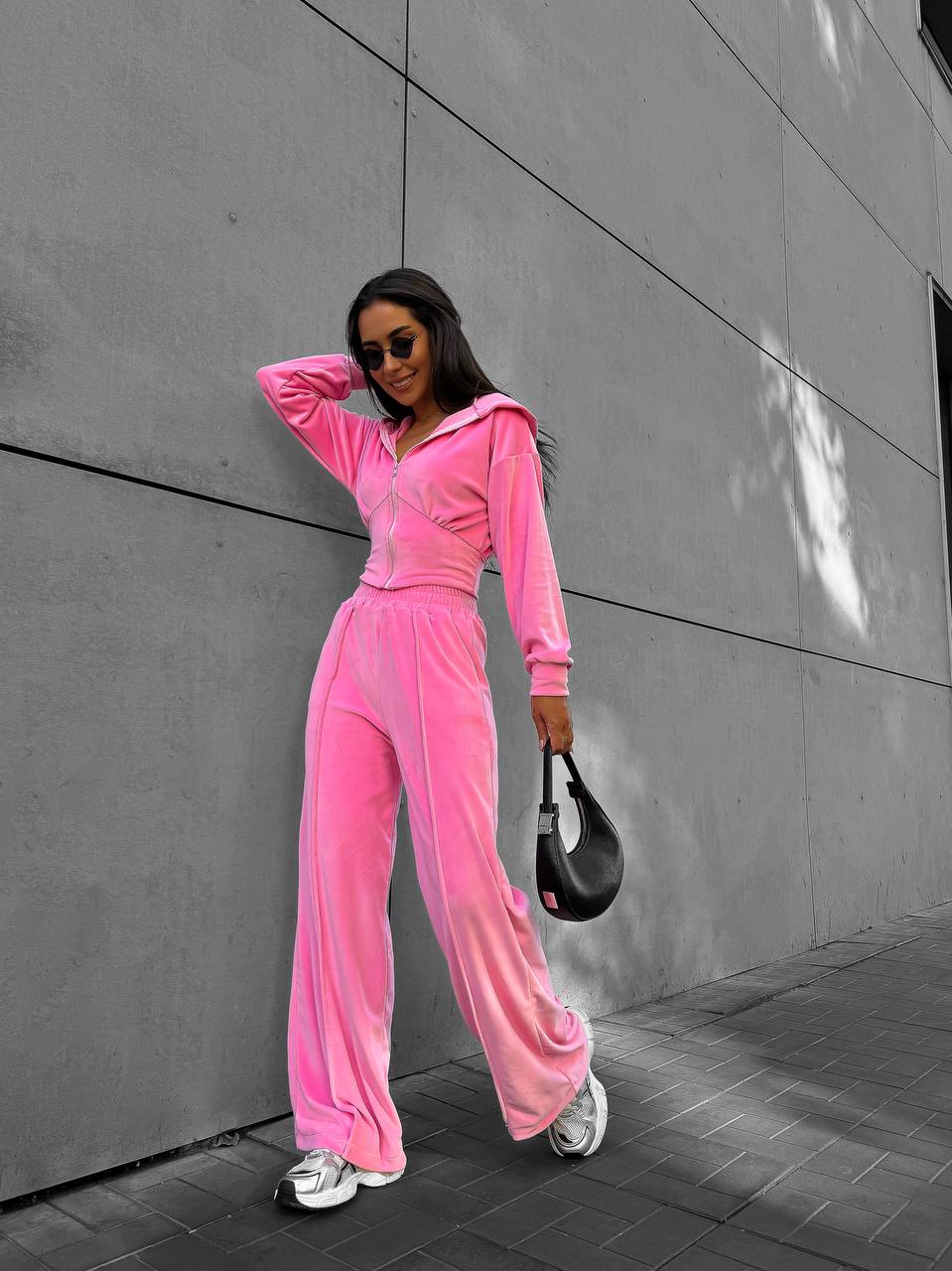 Нежный велюровый костюм (свободные брюки со стрелками+укороченная кофта с акцентом на талии) розовый