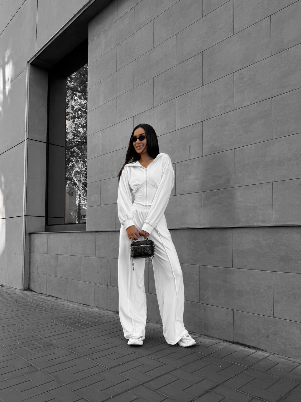 Нежный велюровый костюм (свободные брюки со стрелками+укороченная кофта с акцентом на талии) белый