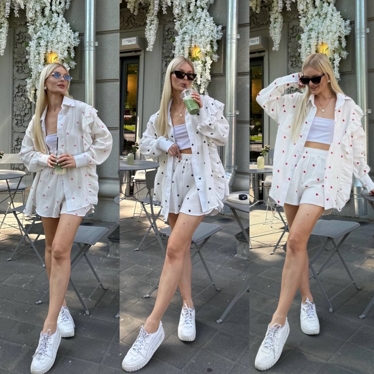 Будьте першим, хто залишив відгук “Нежный женский костюм из муслина (рубашка с воланами+шортики) черные сердечки”“