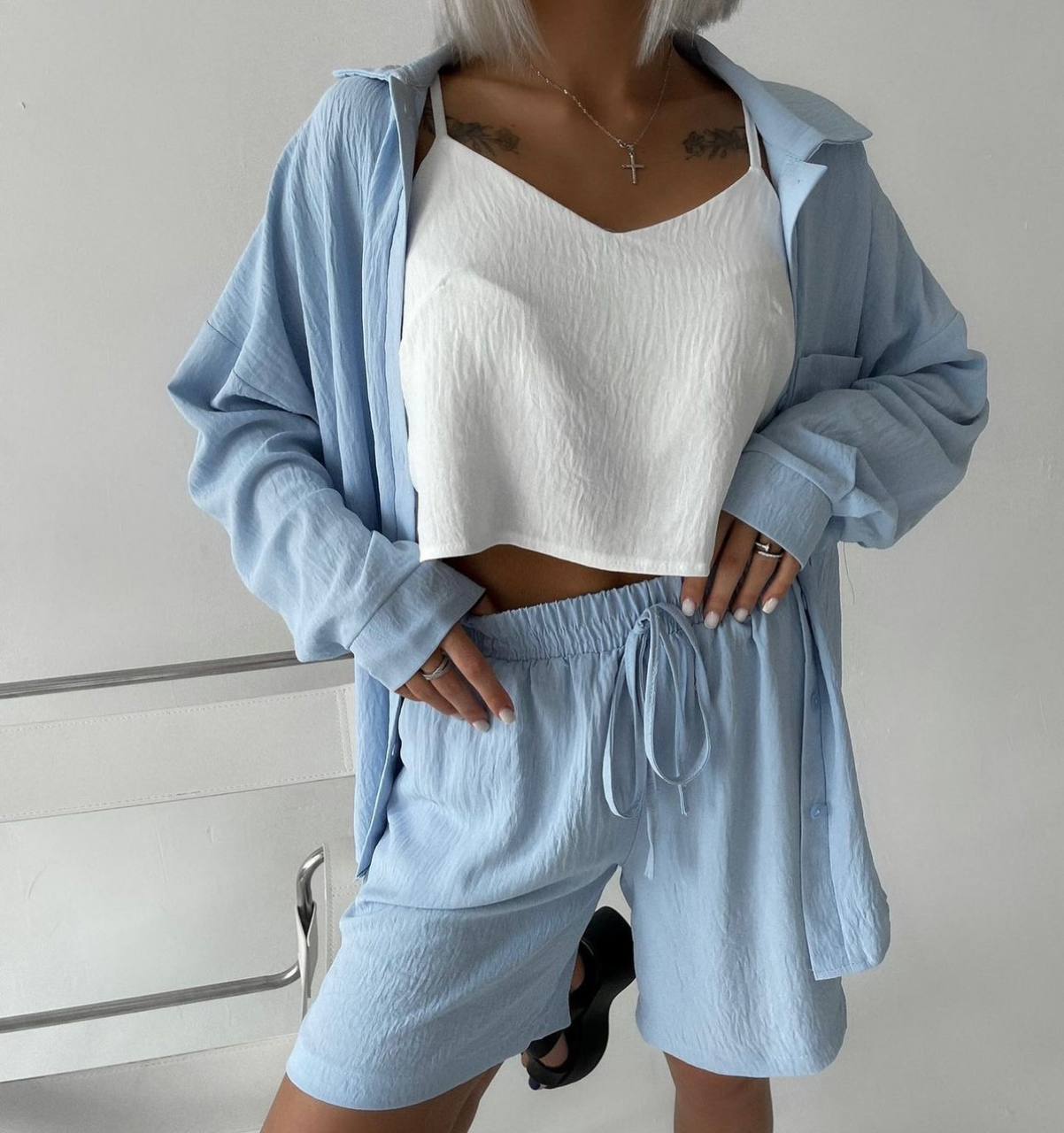 Очень легкий и удобный Костюм 3-я (рубашка+шорты+топ) голубой